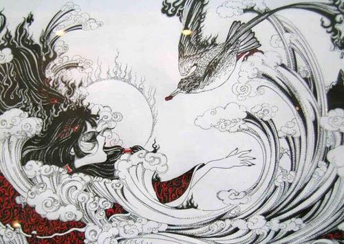 再往北二百里,是发鸠山。山上生长着茂密的柘树林。山中栖息着一种禽鸟,其形状像普通的乌鸦,但头部的羽毛上有花纹,还长着白色的嘴巴、红色的足爪,名字就叫精卫,它发出的叫声就是自己的名字,精卫鸟原是炎帝的小女儿,名叫女娃。她到东海游玩,不慎淹死在东海里,死后她的灵魂就变成了精卫鸟。她悲愤自己年轻的生命被葬送海底,因此常常衔了西山的树枝石子,投到东海里去,想把大海填平。传说现在的山东半岛和辽东半岛,就是精卫填成的。后来民间传说这种鸟就住在海边,和海燕结成配偶,生下的孩子,雌的像精卫,雄的像海燕。至今东海还有精卫誓水的地方,因为曾经淹死在那里,就发誓不再喝那里的水,所以,精卫又称为誓鸟、信鸟,古人认为它是一种有志气的禽鸟,并把它当作追求理想和毅力的化身。
