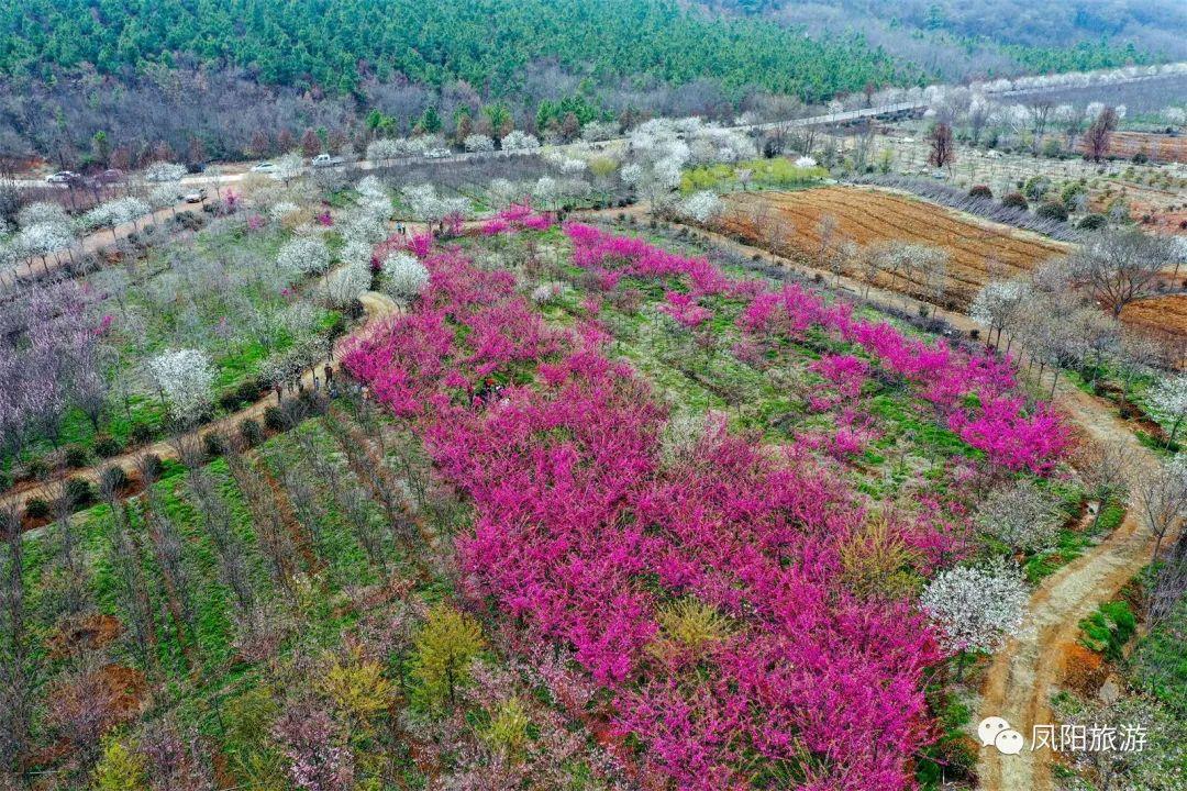 明中都遗址公园,园内百花竞放,报春梅花、粉嫩晚樱、国色牡丹、四时月季、清冽荷花,花花世界,姿态万千;改革之乡小岗村艺术油菜田画、草莓、葡萄水果采摘;安徽省特色旅游名镇的卸店村、白云村,古杏春晓、绚烂油菜花、浪漫樱花谷、碧波卧牛湖,如至画中;熔岩地貌韭山洞,春夏之交,观“水中大熊猫”桃花水母,赏茂林翠木,野槐无瑕,紫藤成簇。